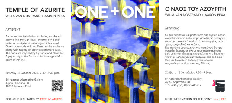 The Temple of Azurite, an immersive installation, activated all the senses – sight, taste, sound, touch, and smell. The art project included light installation, video projection, set pieces, and vocal performance. The three-act performance culminated in the offering of a wine-based elixir created from botanicals foraged from ancient sites to all gallery guests. This neo-kykeon, a potable allusion to the mysterious and sacred drink of the Eleusinian Mysteries, was both part of a ceremonial ritual and of the ‘embodiment’ concept of the performance. It was served in distinct stoneware cups Pexa created in Athens inspired by the Cycladic and Neolithic pottery collections of the National Archeological Museum of Athens. The cups were distributed to gallery guests during the performance.